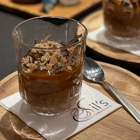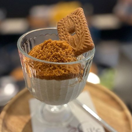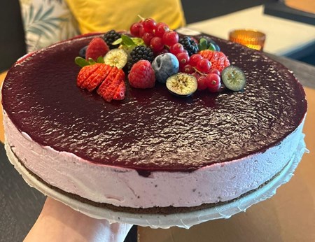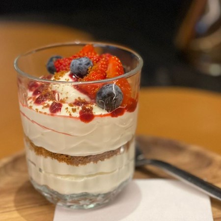 Mascarpone van witte chocolade-crumble-rood fruit-coulis
